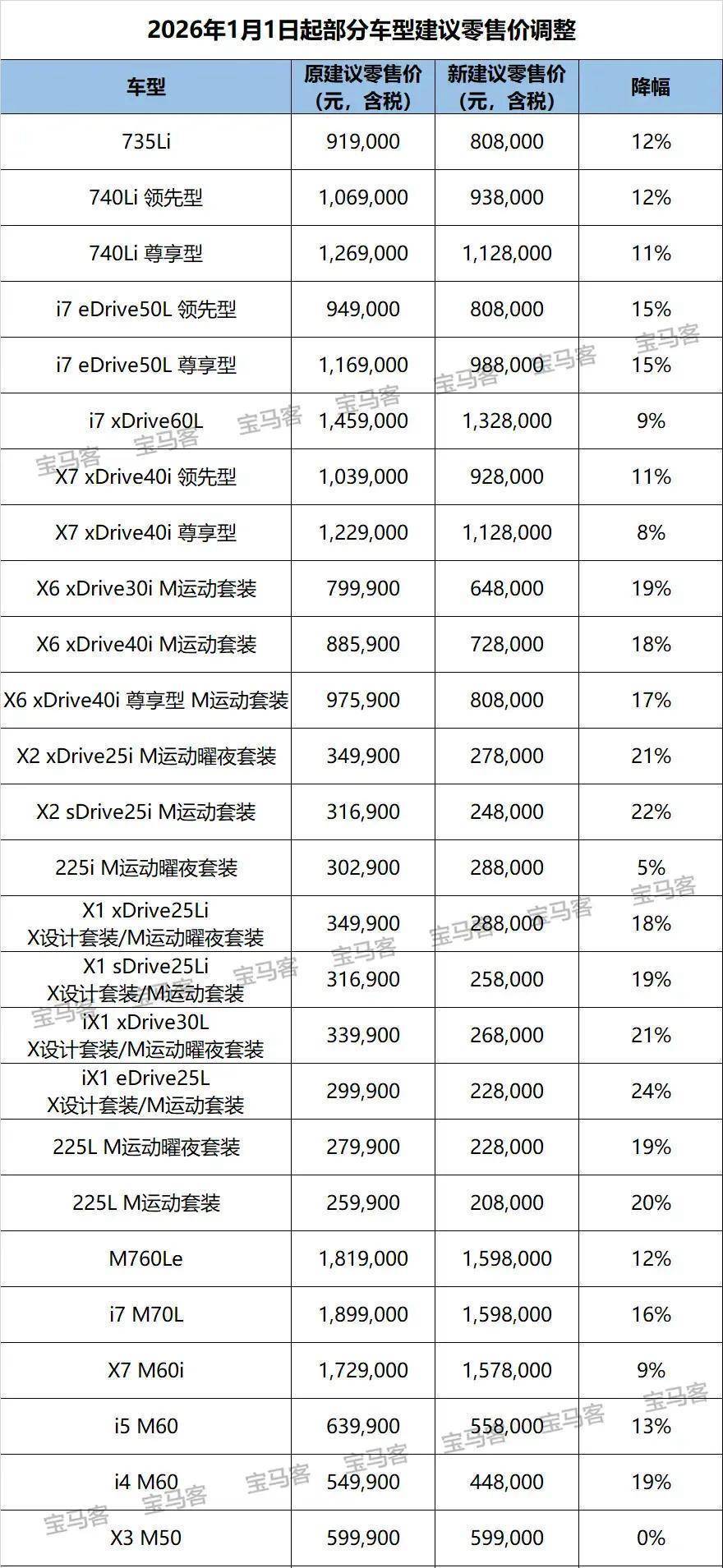 为了挽救岌岌可危的销量,宝马在2026年1月1日,对部分车型的零售价进行了调整,与其说是售价调整,不如说是“官降”,因为这25款车型存在5%-24%不等的价格下降,只有宝马X3 M50的价格未发生变动。