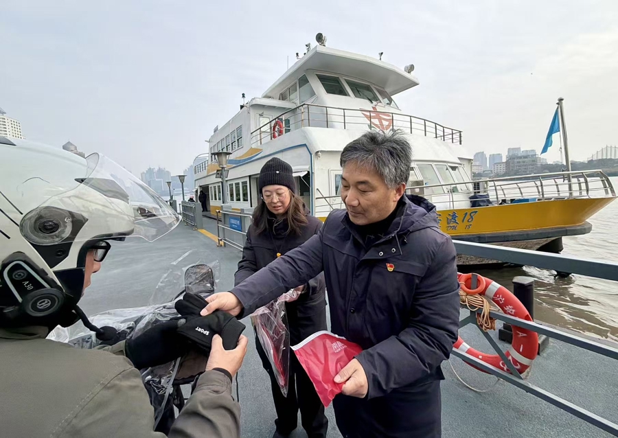 上海轮渡工作人员为市民和游客发放爱心手套。