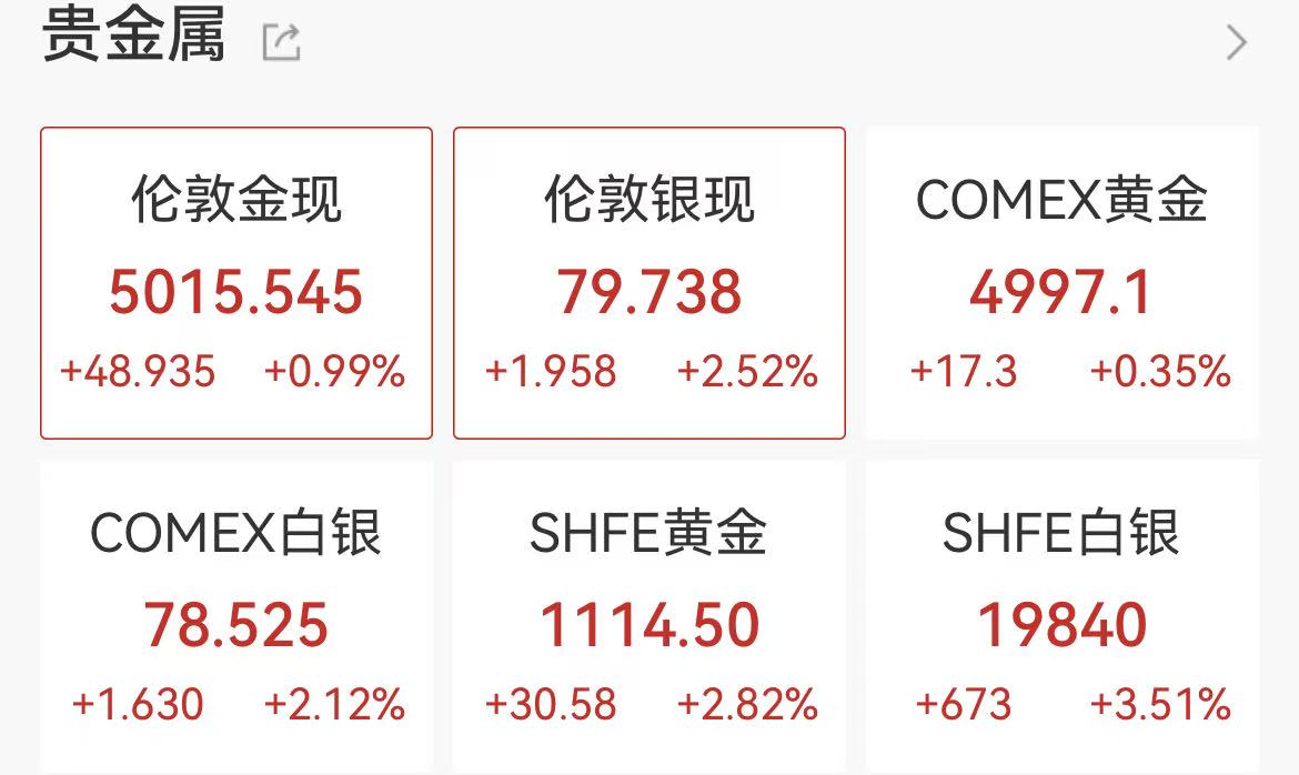 现货白银日内涨超2%,报79.59美元/盎司。现货黄金逼近5000美元/盎司。