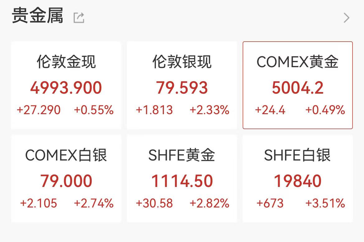 2月9日,现货黄金、白银表现出反弹态势。现货黄金逼近5000美元/盎司;现货白银日内一度涨超2%。